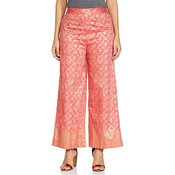 - Pink coloured straight palazzos with ornamental foil print detail and elasticated waistband.