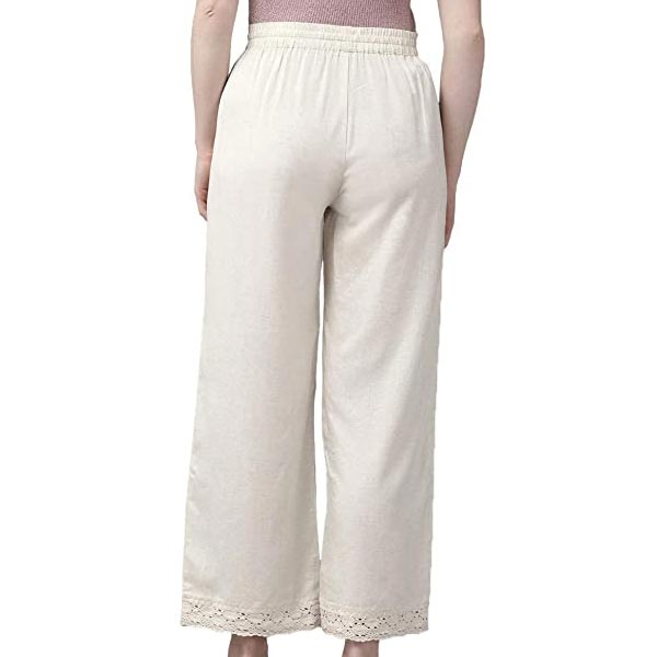 • Offwhite Rayon Flex Solid Wide Leg Palazzo with Lacework in Hem & Side Pocket